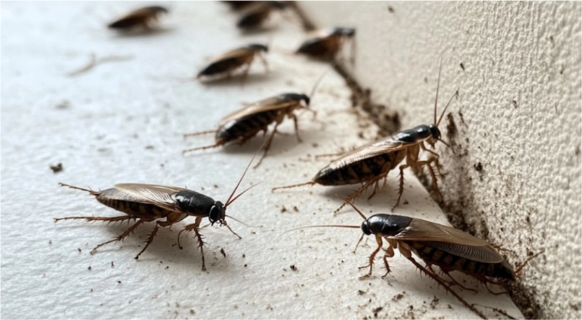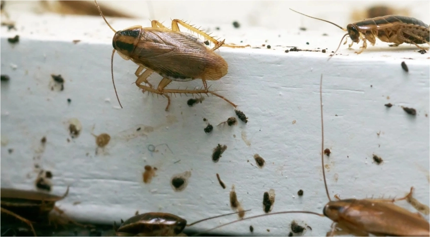 Cockroaches leave brownish smear marks on walls, floors, and surfaces in humid areas. These marks indicate active roach movement and the presence of infestation.