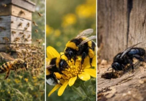 Honeybees pollinate one-third of our food, with colonies containing 20,000-80,000 bees. Bumblebees defend nests aggressively despite being generally docile. Carpenter bees damage wood structure.
