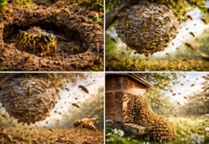 Wasps build nests in attics, wall cavities, under decking, garden sheds, and underground burrows. Yellow jacket bee hive colonies occupy abandoned rodent holes and beneath porches. Hornets prefer elevated locations like trees.