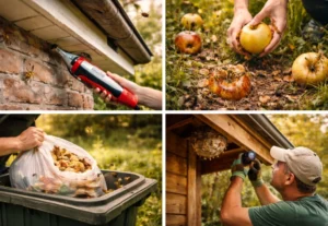 Seal exterior wall cracks, and foundation gaps before spring. Remove food sources: fallen fruit, uncovered garbage, sugary spills. Inspect property monthly during warm months for early nests when removal remains simpler.